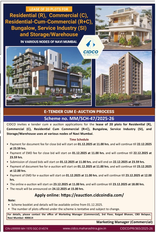 The City and Industrial Development Corporation of Maharashtra (CIDCO) has launched an e-tender cum e-auction scheme for the lease of 20 prime plots across various nodes of Navi Mumbai. Encompassing residential, commercial, bungalow, service industry, and storage/warehouse uses, this initiative targets developers, investors, and businesses seeking opportunities in one of India’s fastest-growing urban corridors. The announcement, under E-Tender Cum E-Auction Scheme MM/SCH-47/2025-26, aligns with CIDCO’s strategy to fuel Navi Mumbai’s expansion, bolstered by the nearing Navi Mumbai International Airport and ongoing metro connectivity.