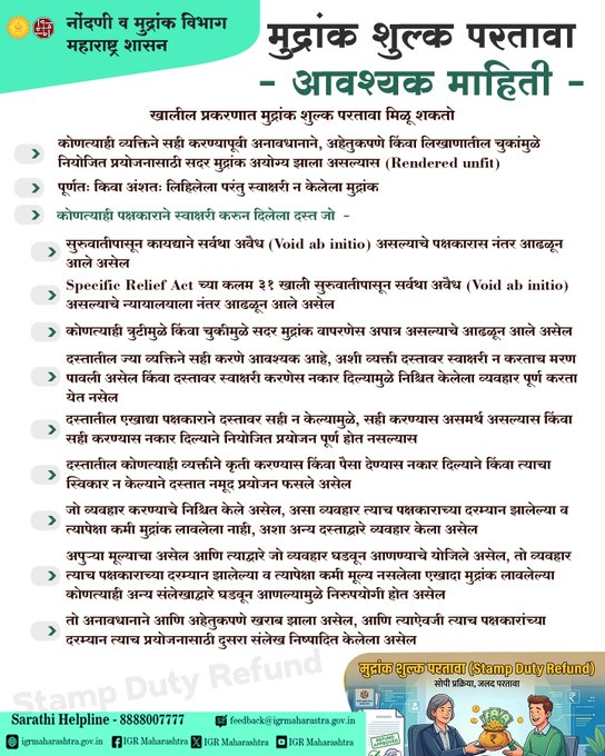 The Department of Registration and Stamps, Government of Maharashtra, has issued an official advisory clearly listing the situations in which citizens can claim a refund of stamp duty paid on agreements, deeds, and other instruments.